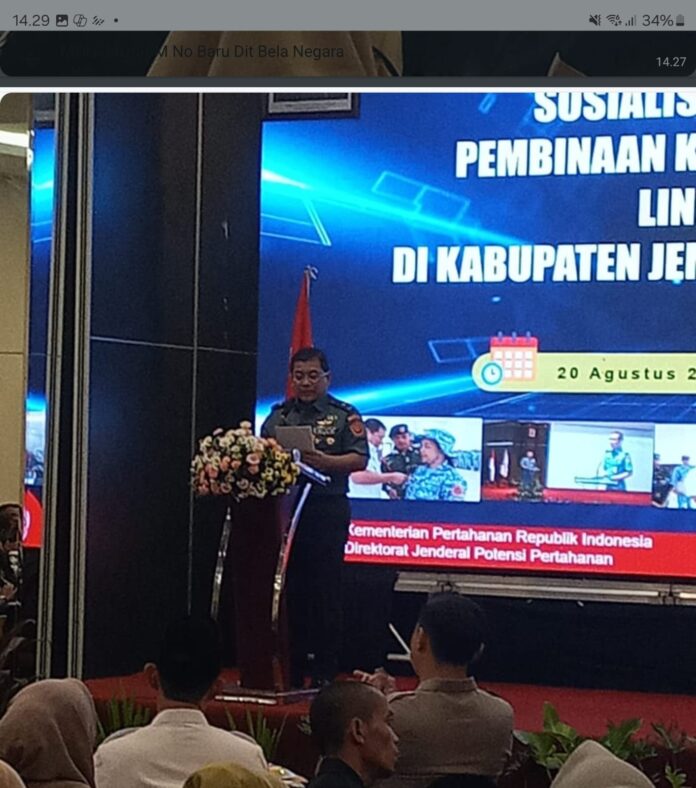 Kementerian Pertahanan Republik Indonesia menggelar Sosialisasi Pembinaan Kesadaran Bela Negara Lingkup Pekerja di Kabupaten Jember Provinsi Jawa Timur dalam rangka menyebarluaskan Nilai Dasar Bela Negara. Amanat Direktur Jenderal Potensi Pertahanan Laksda TNI Sri Yanto yang dibacakan Direktur Bela Negara Ditjen Pothan Kemhan Brigadir Jenderal TNI G.Eko Sunarto, S.Pd., M.Si dihadapan peserta Sosialisasi Pembinaan Kesadaran Bela Negara Lingkup Pekerja pada saat pembukaan Sosialisasi di Hotel Aston Jember pada Rabu 20 Agustus 2025.